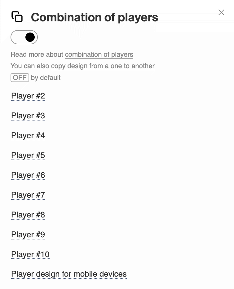 Łączenie odtwarzaczy Przepraszamy, ten artykuł jest dostępny w języku angielskim The combination of players allows you to store several configurations in one player. This is handy if you want to publish on one page several players with different designs or settings.