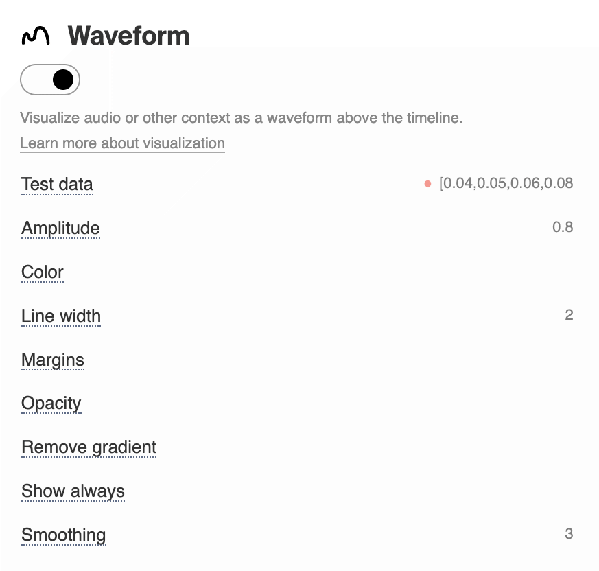 Specify the data in the Test data field -‒ an array of values ​​from 0 to 1 that will capture the context on the timeline. The player will evenly place the points along the timeline, smooth it and draw a graph. More points ‒ more complex graph will be displayed. Working data can be passed in the player code or in the playlist using the waveform parameter